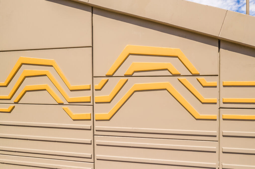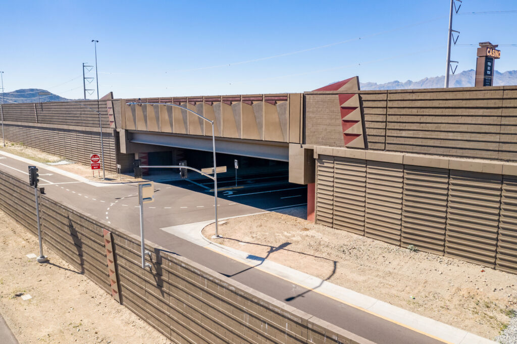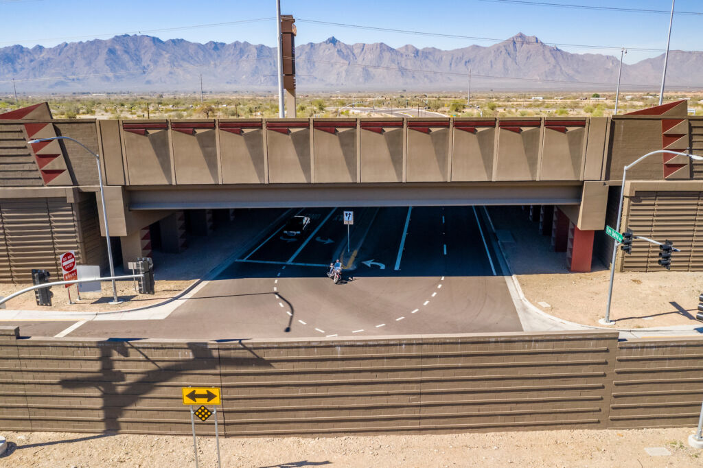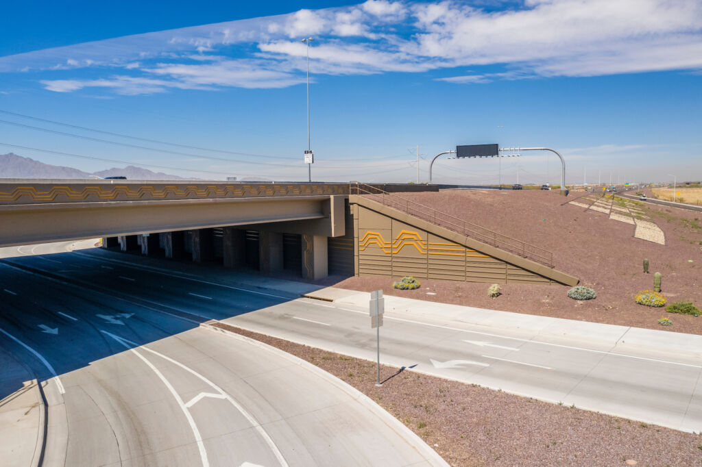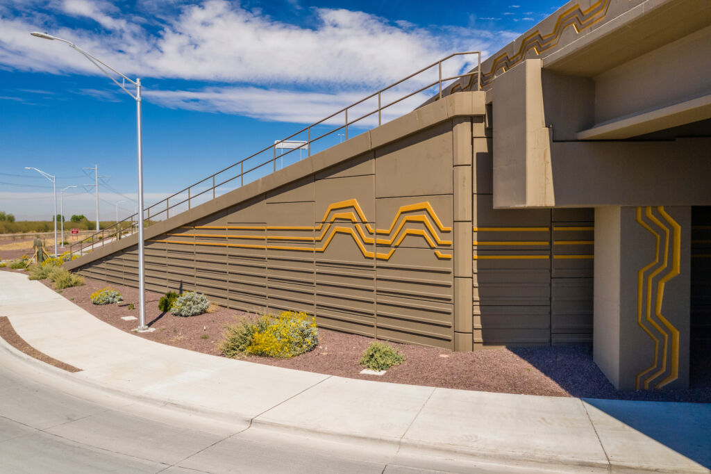 Frank Lloyd Wright’s desert-themed architecture inspired the artwork featured on the walls. Wright had a camp in the area during the 1920s and often experimented with designs tied to the Arizona landscape. ADOT partnered with The Frank Lloyd Wright Foundation to shape the project’s aesthetics. The concrete wall facing, coping, and other elements of the structures were cast with custom patterns and painted in the field.